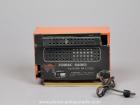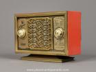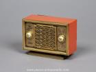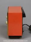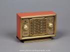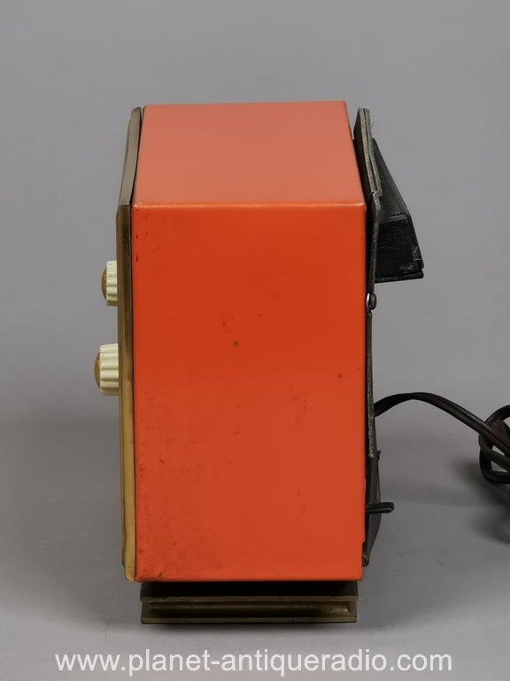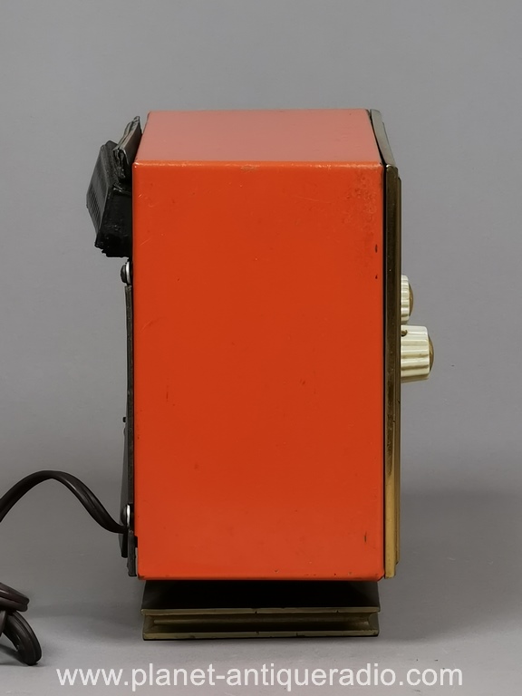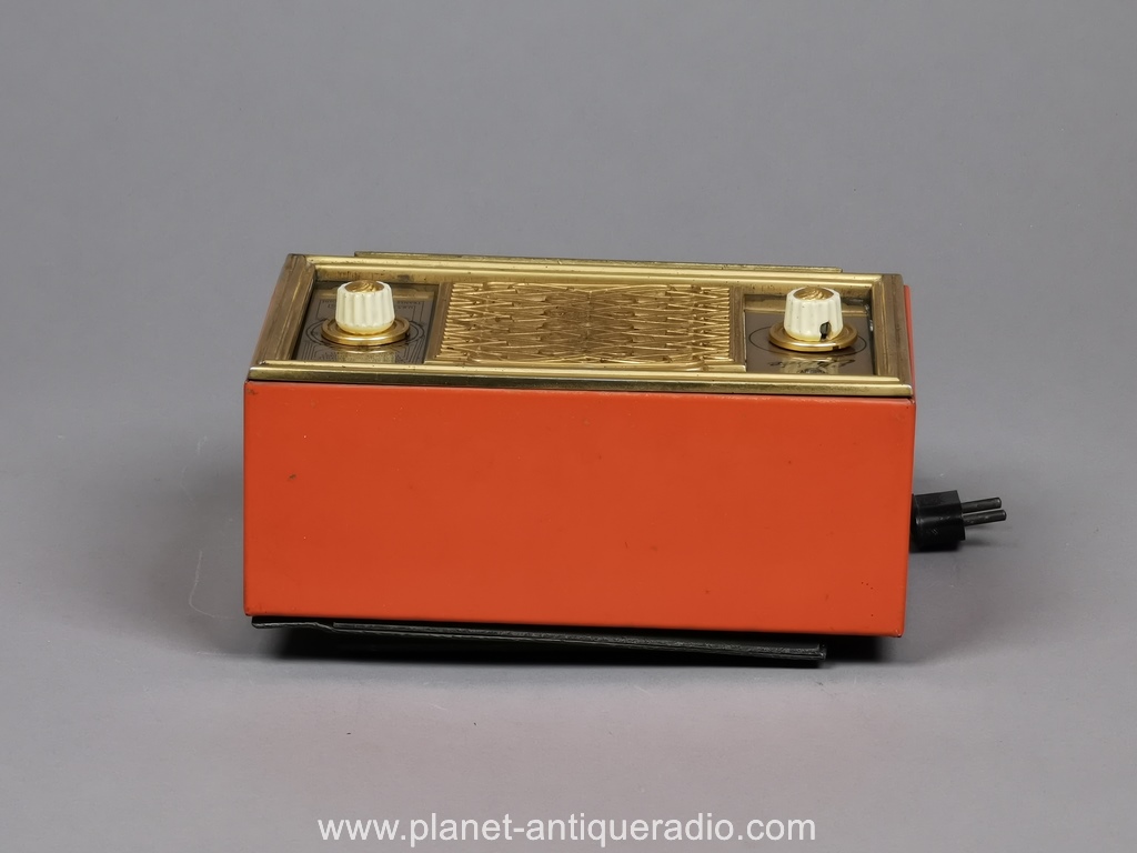 Caisse métallique de couleur rouge orangé. Peinture d'origine bel état présentant une usure d'usage habituelle. Pied bois. Boutons d'origine. Chassis propre et complet. Carton arrière présent mais défraichi. Dimensions(cm) : 21 x 16 x 9 Une jolie petite radio dans une couleur peu courante.